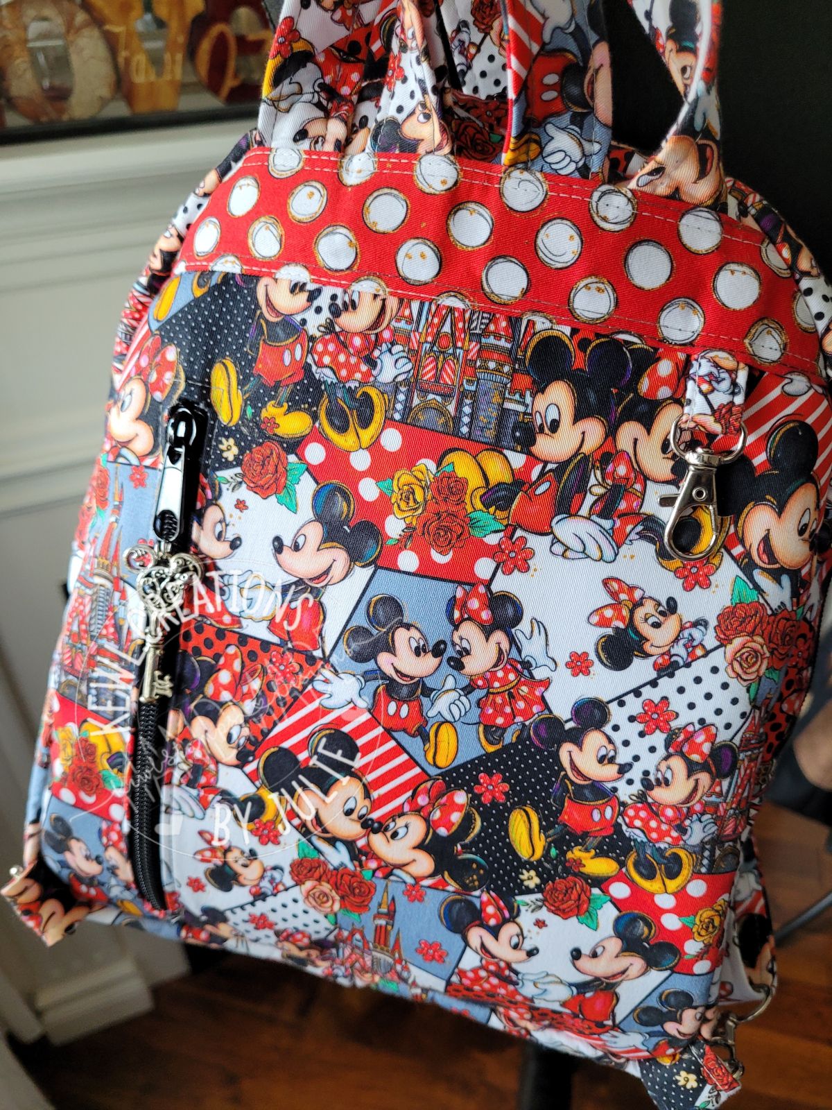 front zipper pocket with slip pockets. Back zipper pocket and swivel clasp for quick access. The main interior has a large slip pocket on the back side. It has custom adjustable straps with a convenient grab handle along the top .
