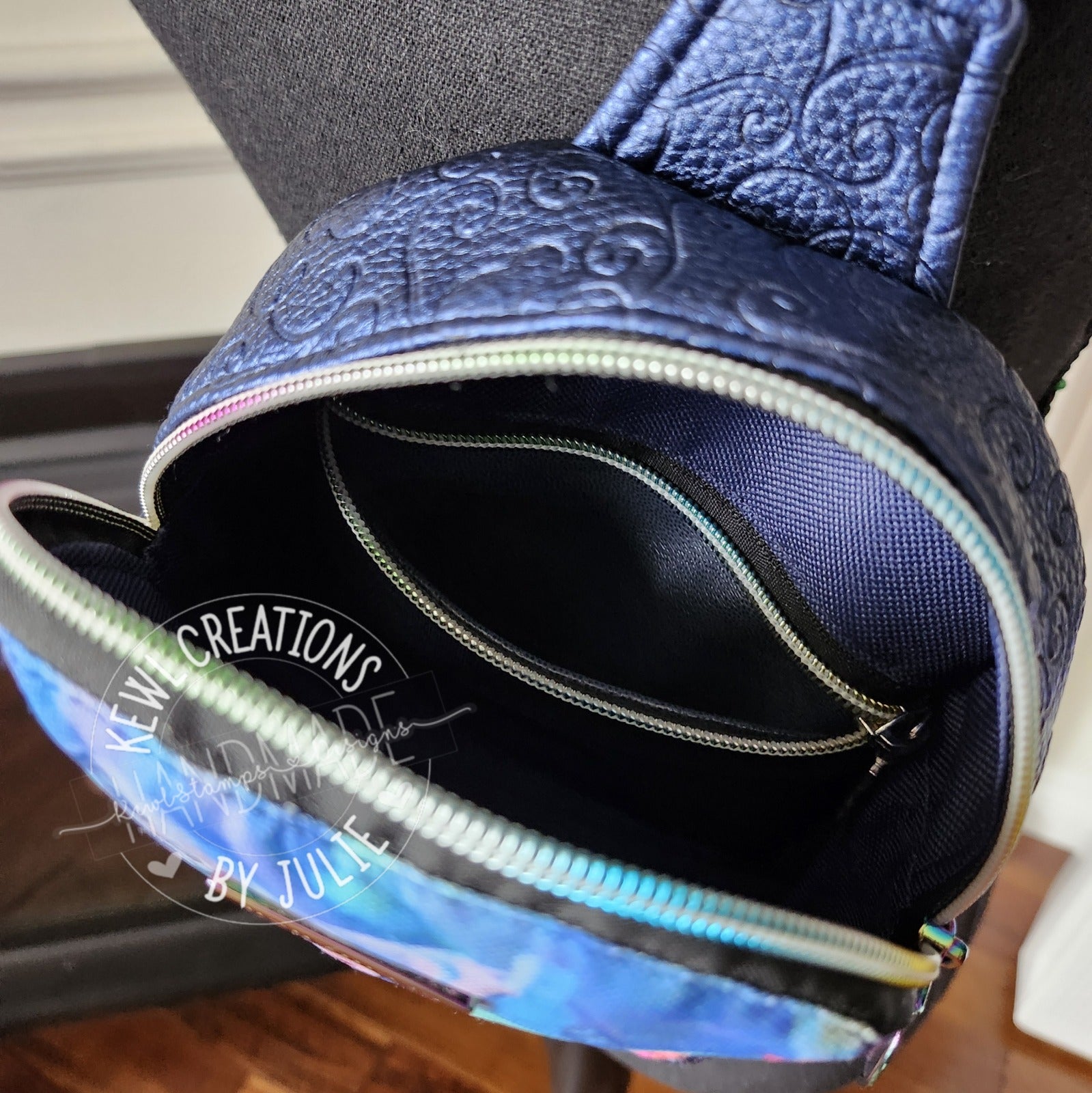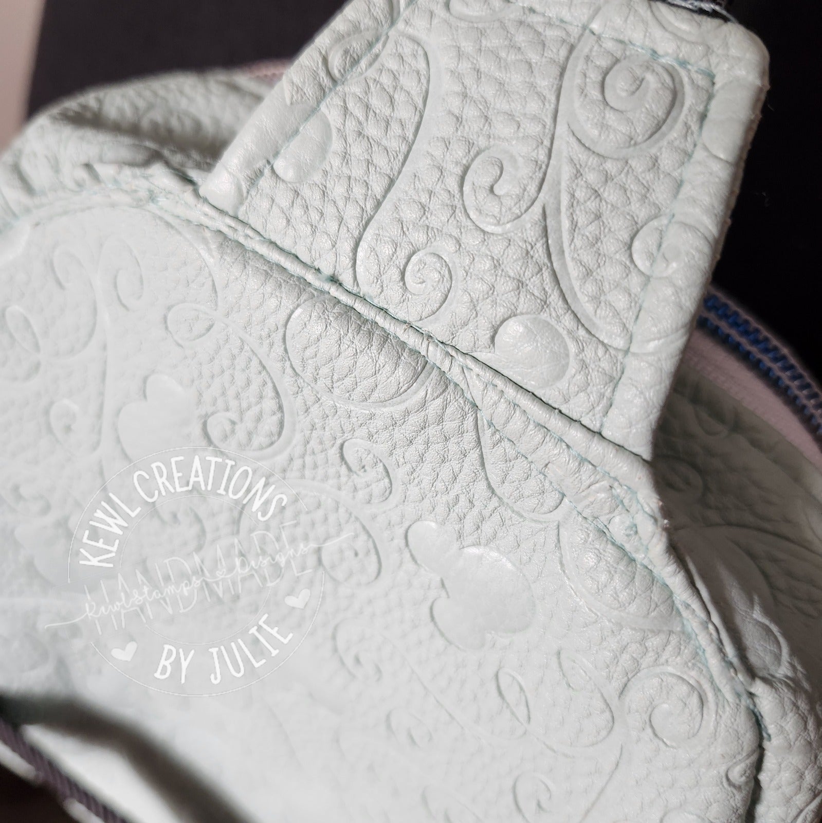Materials: Faux Leather, Cotton Woven Fabric, Waterproof Canvas, fleece and light weight interfacing, Webbing.