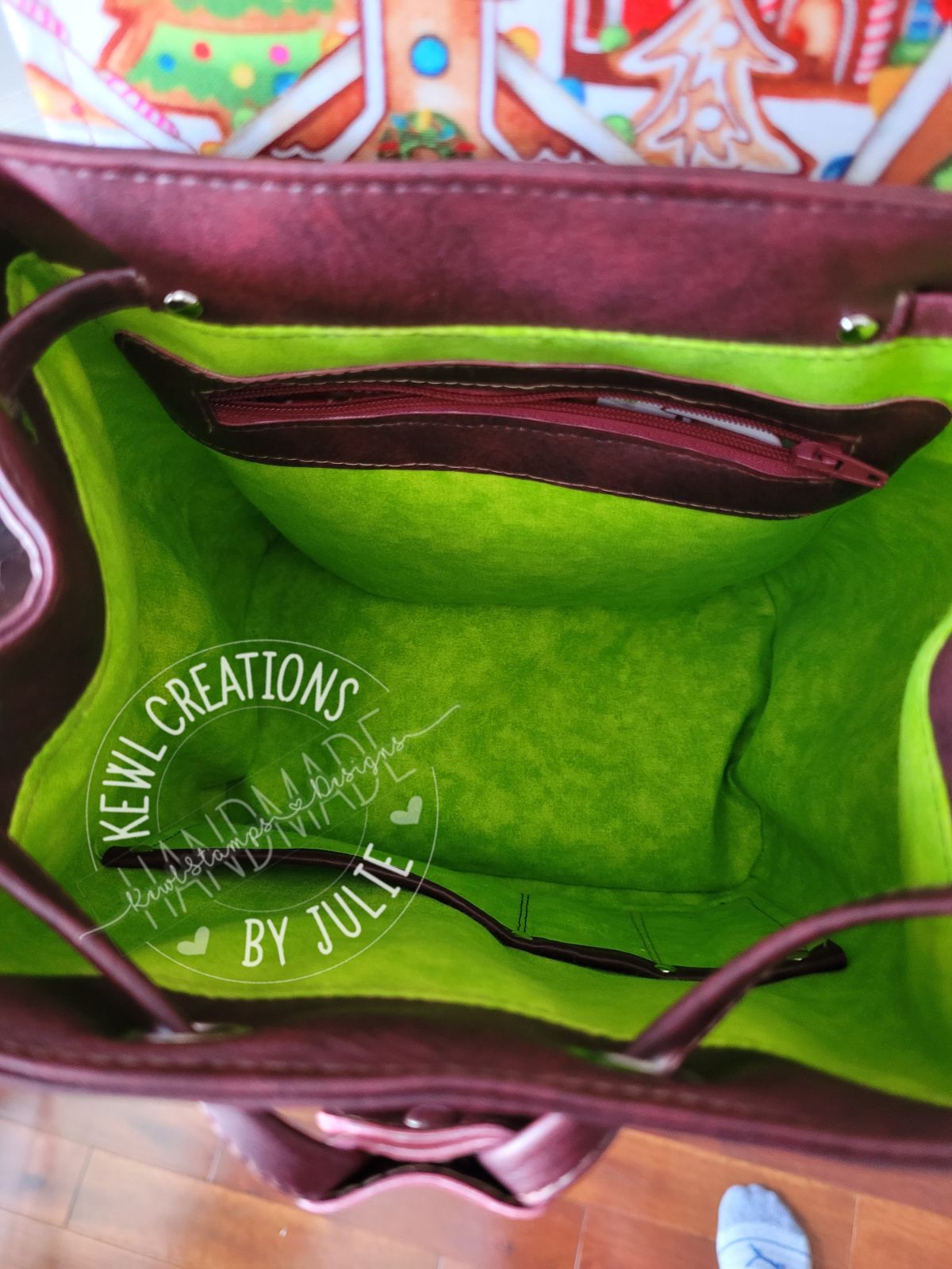 Materials: Faux leather, Nickle hardware, Cotton fabric