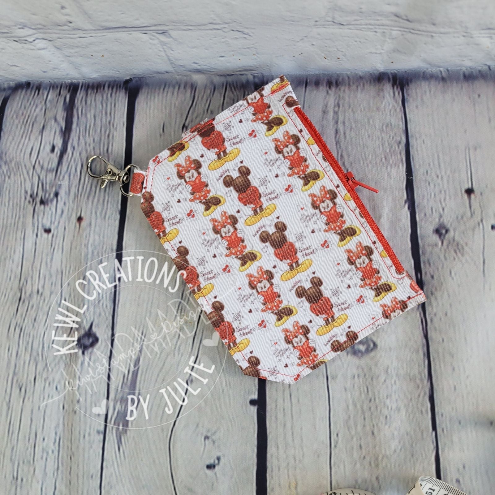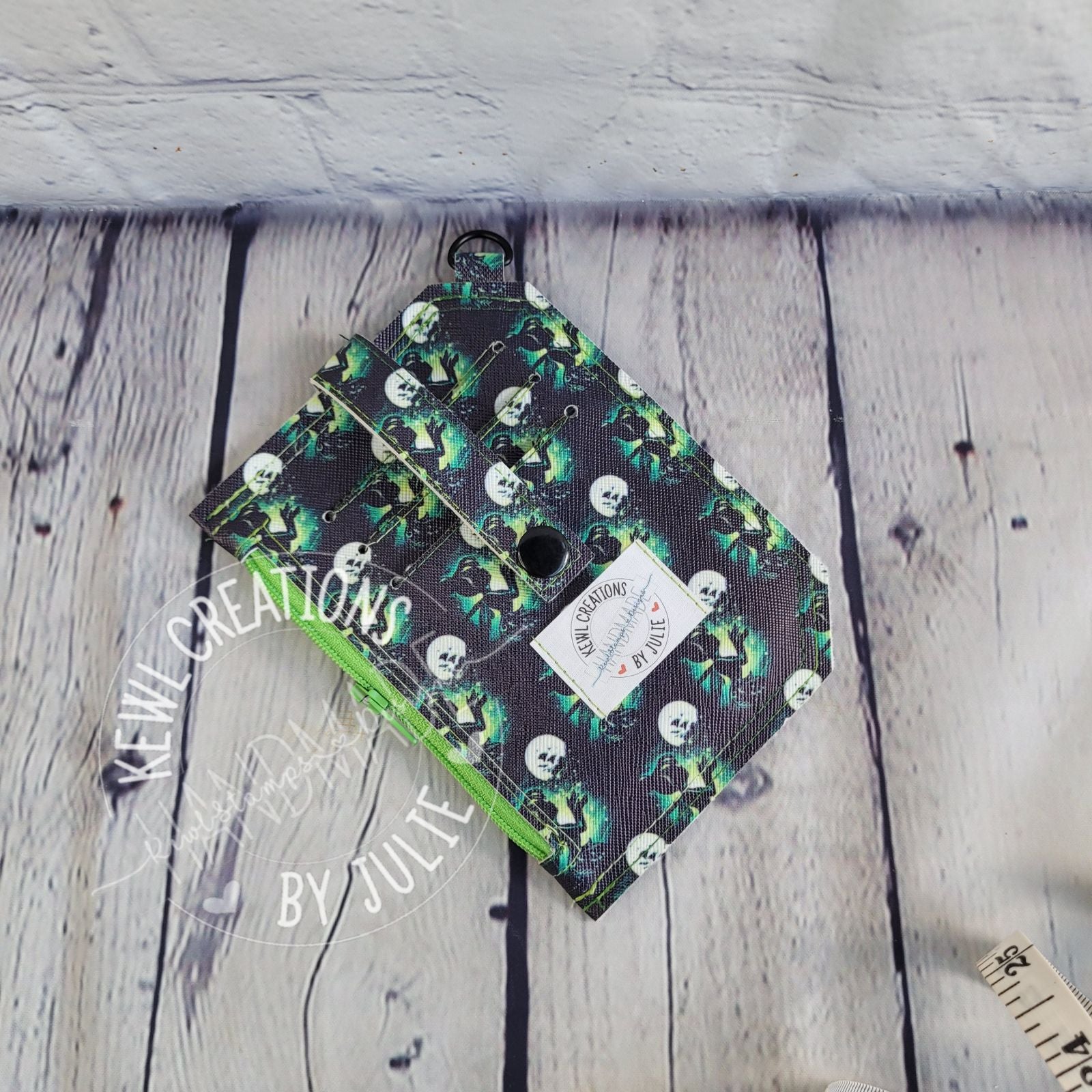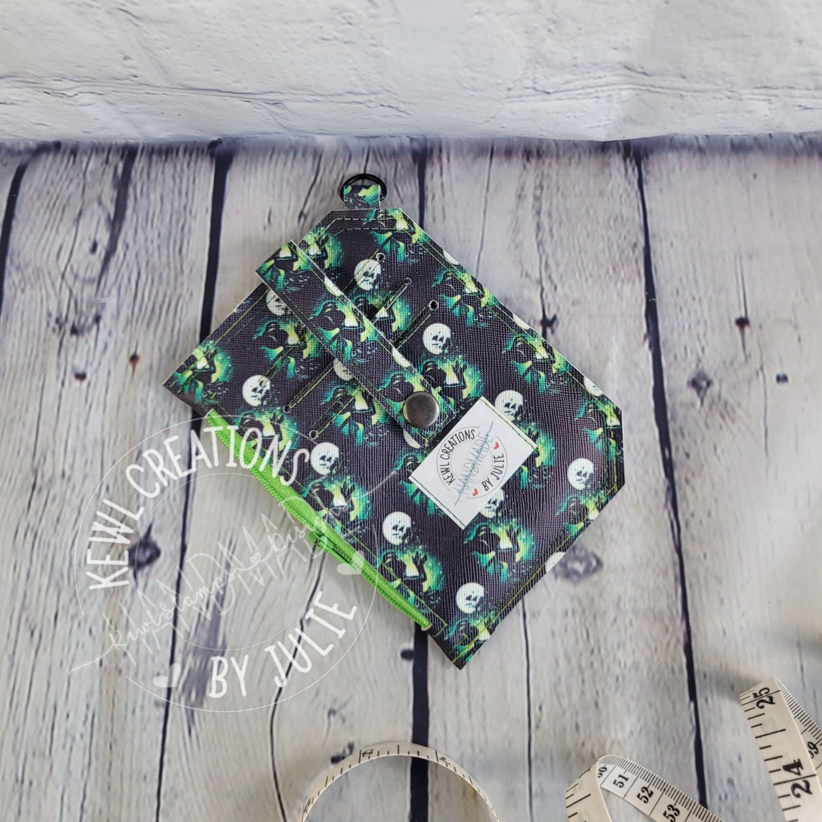 This is a minimalist wallet, pocket pouch. It features 3 card slots with a security snap closure and a zippered main compartment. It also has a clip to hang a key chain from.